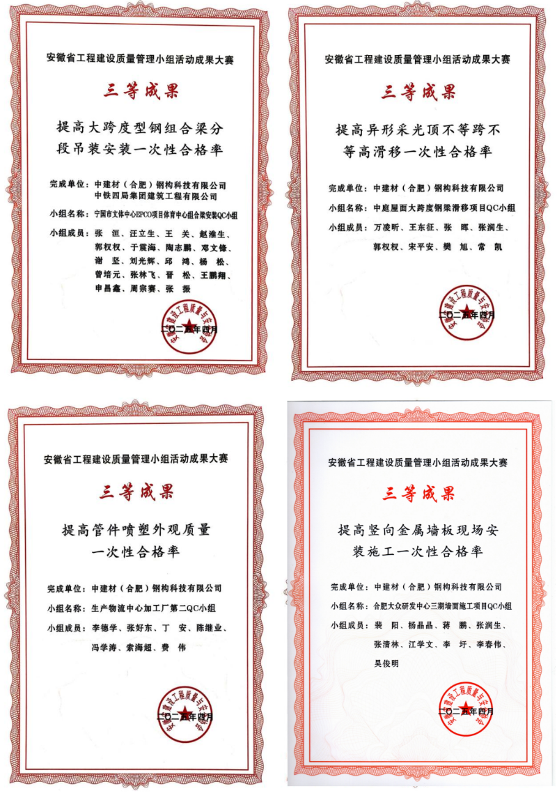 近日,在安徽省工程建設(shè)質(zhì)量管理小組活動(dòng)成果大賽上,中建材鋼構(gòu)公司憑借扎實(shí)的技術(shù)功底、卓越的質(zhì)量管理水平和持續(xù)的創(chuàng)新精神,一舉斬獲10項(xiàng)優(yōu)秀成果大獎(jiǎng)!其中包括2項(xiàng)二等獎(jiǎng)、8項(xiàng)三等獎(jiǎng),獲獎(jiǎng)數(shù)量和質(zhì)量均位居行業(yè)前列,充分展現(xiàn)了中建材鋼構(gòu)公司在工程建設(shè)領(lǐng)域強(qiáng)大的綜合實(shí)力和核心競爭力。